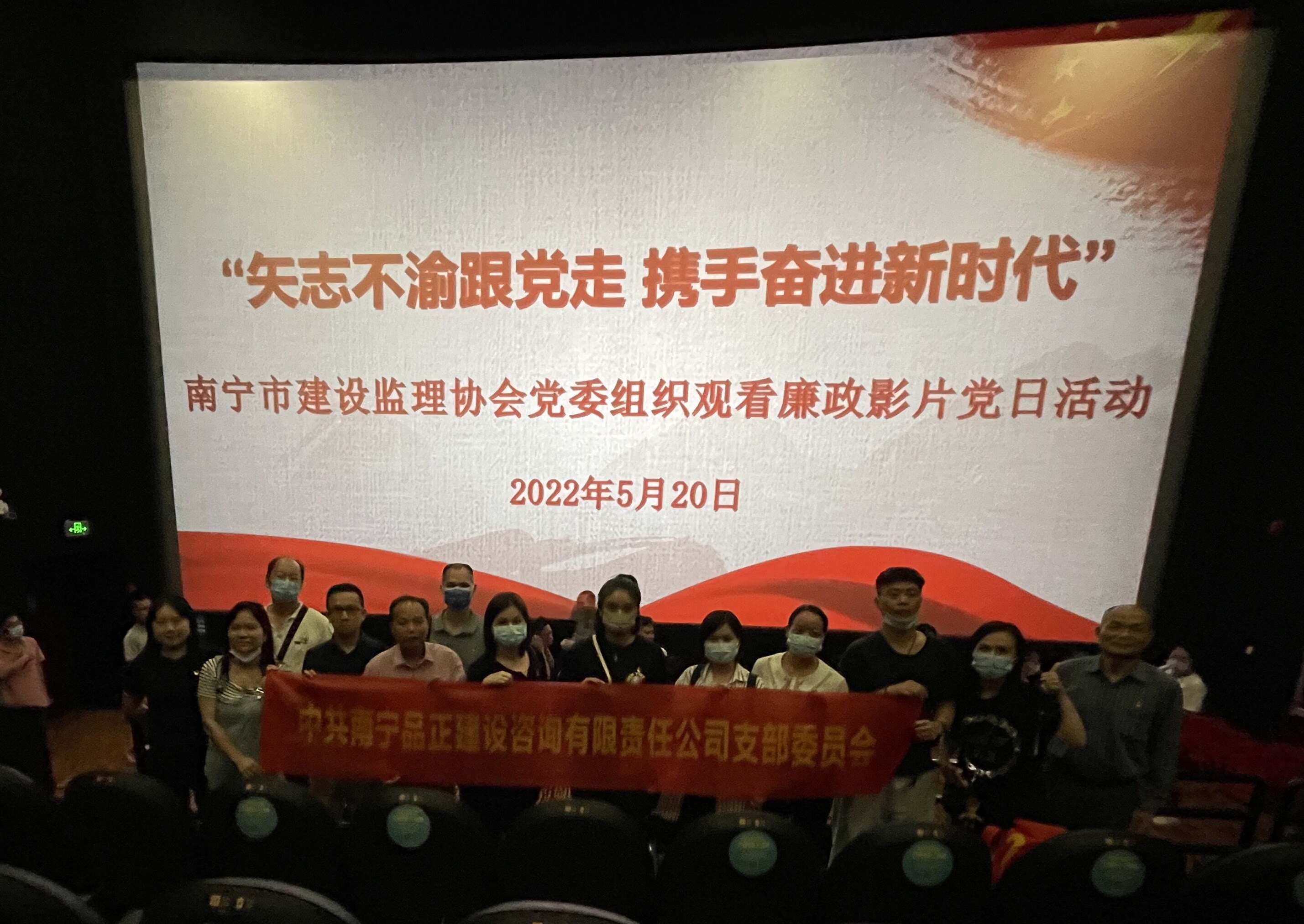 為進(jìn)一步加強(qiáng)反腐倡廉教育,深入推進(jìn)廉政文化建設(shè),學(xué)習(xí)貫徹習(xí)近平總書記關(guān)于黨風(fēng)廉政建設(shè)和反腐敗斗爭(zhēng)的重要言論,2022年5月20日下午,南寧市建設(shè)監(jiān)理協(xié)會(huì)黨委開展“黨風(fēng)廉政”主題黨日活動(dòng),組織觀看反腐倡廉電影《決不姑息》,接受黨風(fēng)廉政警示教育。公司黨支部組織全體黨員及入黨積極分子一起觀影。
