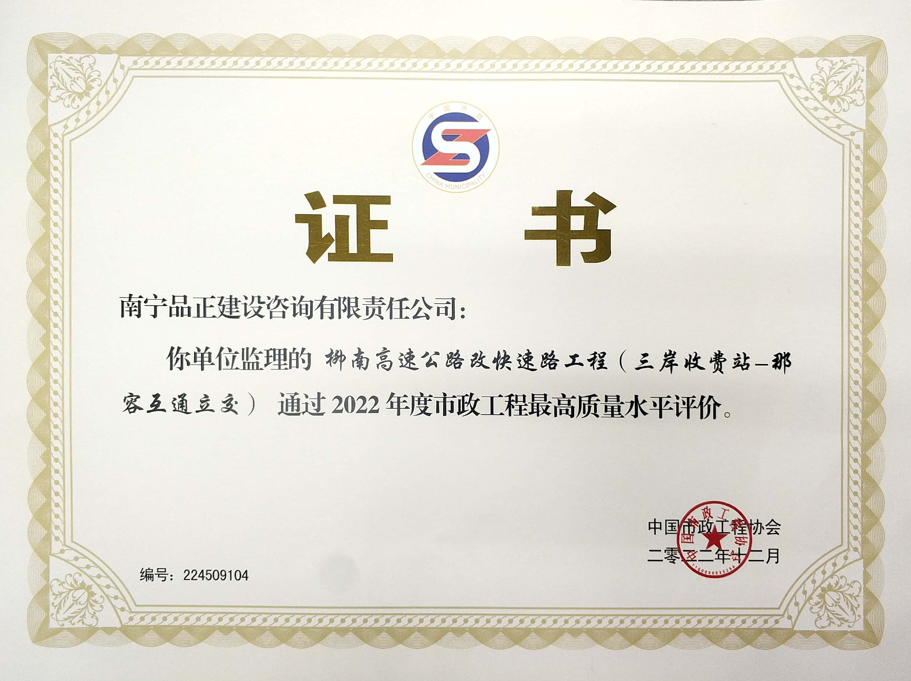 南寧品正建設(shè)咨詢有限責(zé)任公司監(jiān)理的柳南高速公路改快速路工程(三岸收費站-那容互通立交)獲“市政工程最高質(zhì)量水平評價”(原國家市政工程金獎)榮譽!市政工程最高質(zhì)量水平評價由中國市政工程協(xié)會評選,是市政工程行業(yè)在工程質(zhì)量方面最高的質(zhì)量水平評價,代表市政工程行業(yè)同時期國內(nèi)先進(jìn)水平。