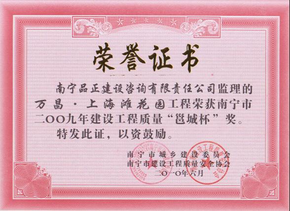 2010年6月,南寧品正負責(zé)監(jiān)理的南寧市南站南側(cè)路工程C標(biāo)、E標(biāo)、南寧市江南堤路園項目市政工程道路施工1#標(biāo)、南寧市精品線路綜合整治工程(一期)B標(biāo)、南寧市五象廣場周邊區(qū)域市政設(shè)施綜合整治工程I標(biāo)工程、南寧市五象廣場周邊區(qū)域市政設(shè)施綜合整治工程I標(biāo)、南梧大道工程(高速環(huán)二塘收費站到三塘下丹橋)NO.7標(biāo)段、萬昌·上海灘花園工程、廣西明陽工業(yè)園啟動區(qū)道路工程III標(biāo)等多個工程分別榮獲南寧市城鄉(xiāng)建設(shè)委員會、南寧市建設(shè)工程質(zhì)量安全協(xié)會頒發(fā)的南寧市2009年建設(shè)工程質(zhì)量“邕城杯”獎。
